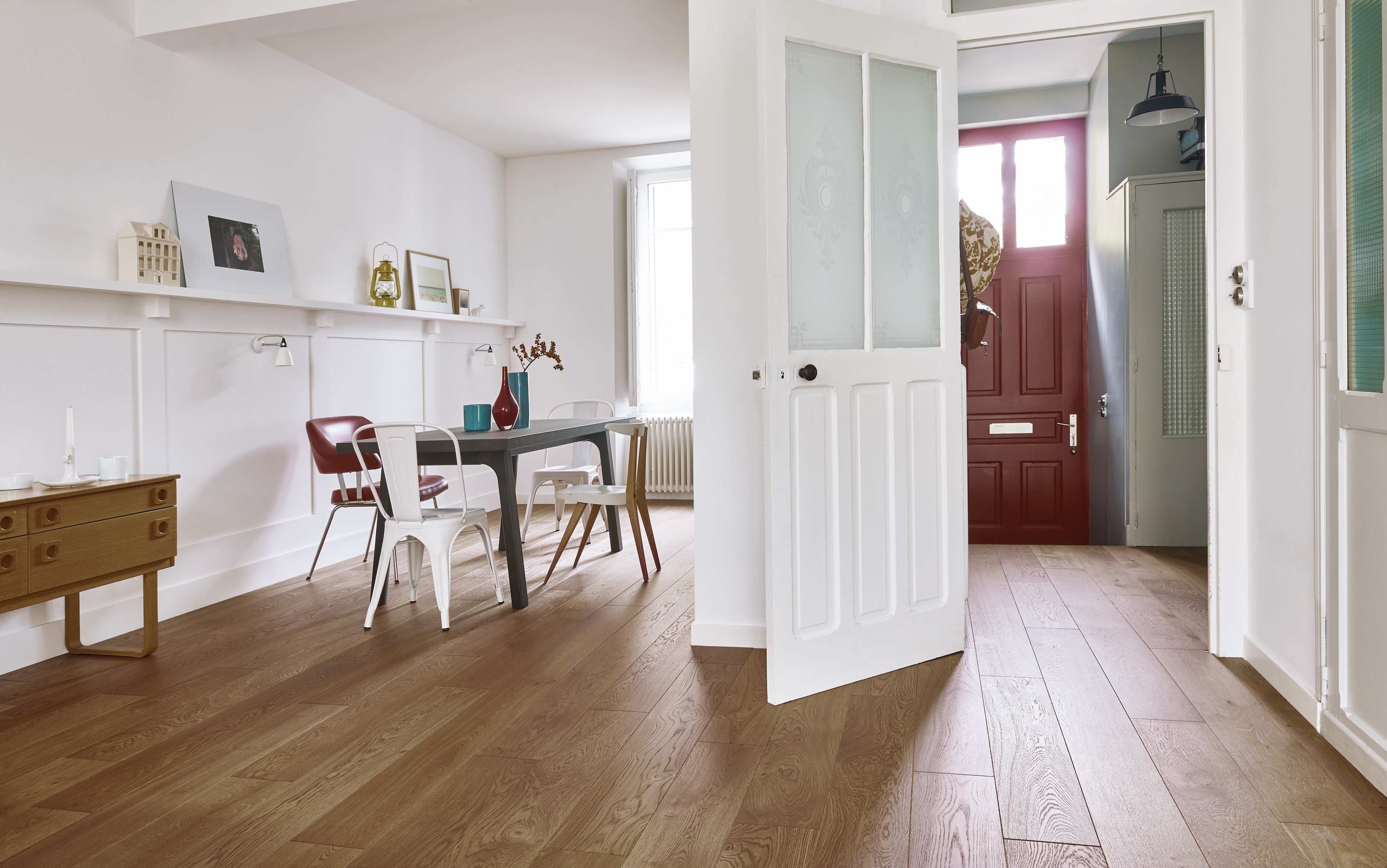 Parquet massif : avec sa finition huilée naturelle, il offre un aspect rustique idéal pour réchauffer un intérieur contemporain ou traditionnel.